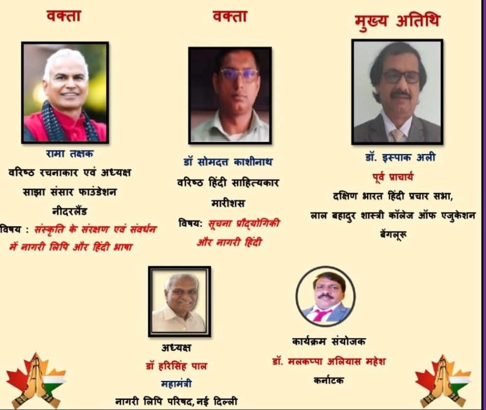 नई दिल्ली/बेंगलुरु , देश- विदेश में नागरी लिपि का प्रचार- प्रसार करने वाली प्रतिनिधि संस्था नागरी लिपि परिषद की कर्नाटक इकाई द्वारा हिंदी दिवस के अवसर पर ‘ अंतरराष्ट्रीय नागरी लिपि विमर्श एवं सम्मान समारोह ‘ का भव्य आभासी आयोजन किया गया है।इसकी अध्यक्षता नागरी लिपि परिषद के महामंत्री और न्यूयॉर्क अमेरिका से प्रकाशित वैश्विक हिंदी पत्रिका सौरभ के संपादक डॉ हरिसिंह पाल ने की। बेंगलुरु के पूर्व प्राचार्य डॉ इसपाक अली मुख्य अतिथि के रूप में और साझा संसार के अध्यक्ष एवं नागरी लिपि परिषद की नीदरलैंड्स के प्रभारी डॉ रामा तक्षक और परिषद की मारीशस इकाई के प्रभारी डॉ सोमदत्त काशीनाथ वक्ता तथा जैन विश्वविद्यालय की पूर्व संकायाध्यक्ष डॉ मैथिली पी राव विशिष्ट अतिथि के रूप उपस्थित रहे।