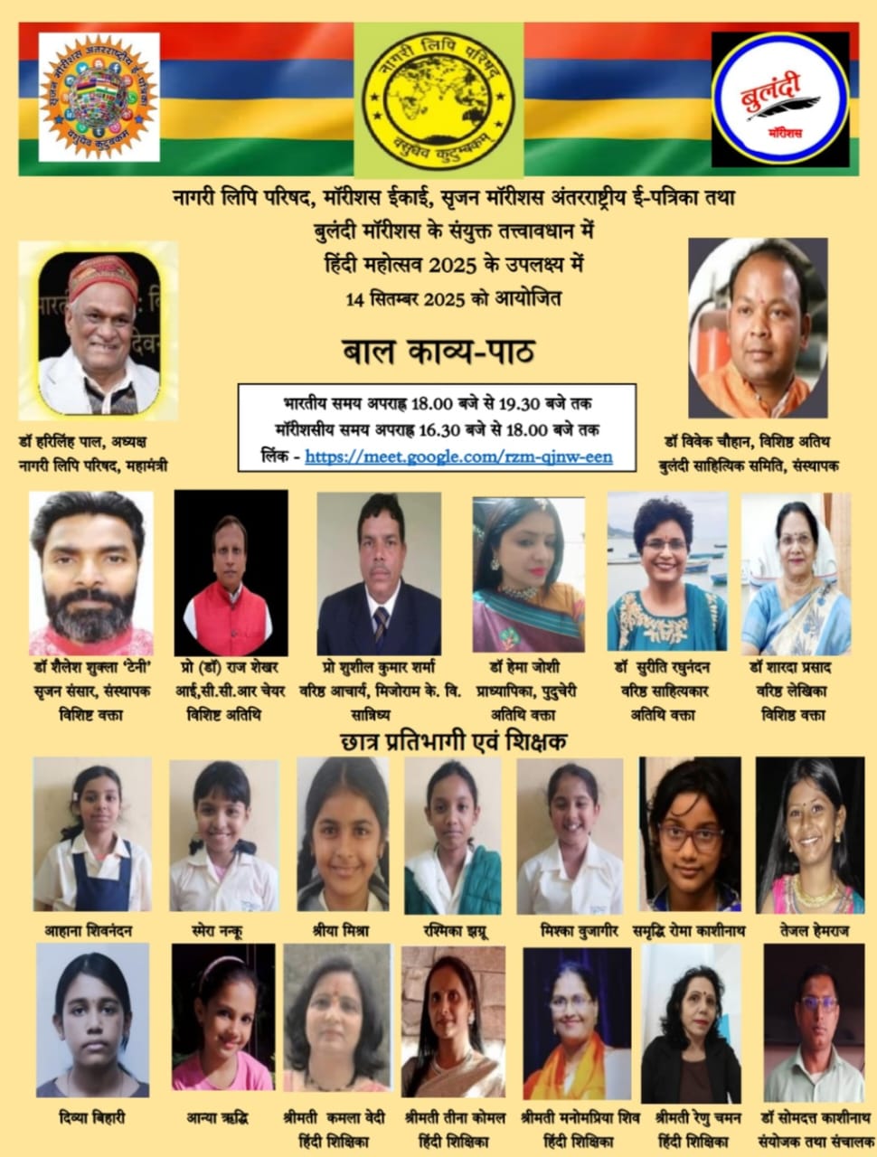 नई दिल्ली/ पोर्टलुई , नागरी लिपि परिषद की मॉरिशस इकाई ने सृजन मॉरिशस अंतरराष्ट्रीय ई पत्रिका और बुलंदी मॉरिशस के संयुक्त तत्वावधान में हिंदी महोत्सव के अवसर पर एक आभासी बाल काव्य पाठ गोष्ठी का सफलतापूर्वक आयोजन किया।इसकी अध्यक्षता नागरी लिपि परिषद नई दिल्ली के महामंत्री और न्यूयॉर्क अमेरिका से प्रकाशित वैश्विक हिंदी पत्रिका सौरभ के प्रधान संपादक डॉ हरिसिंह पाल ने की। इसमें मिजोरम विश्वविद्यालय आइजॉल के हिंदी विभागाध्यक्ष डॉ सुशील कुमार शर्मा, मॉरिशस में भारतीय सांस्कृतिक संबंध परिषद पीठ के आचार्य डॉ राजशेखर , सृजन संसार के संस्थापक डॉ शैलेश शुक्ल टेनी, पुदुचेरी की प्राध्यापक डॉ हेमा जोशी ,सुरीति रघुनंदन और बुलंदी साहित्यिक समिति के संस्थापक डॉ विवेक चौहान विशिष्ट अतिथि के रूप में उपस्थित रहे।