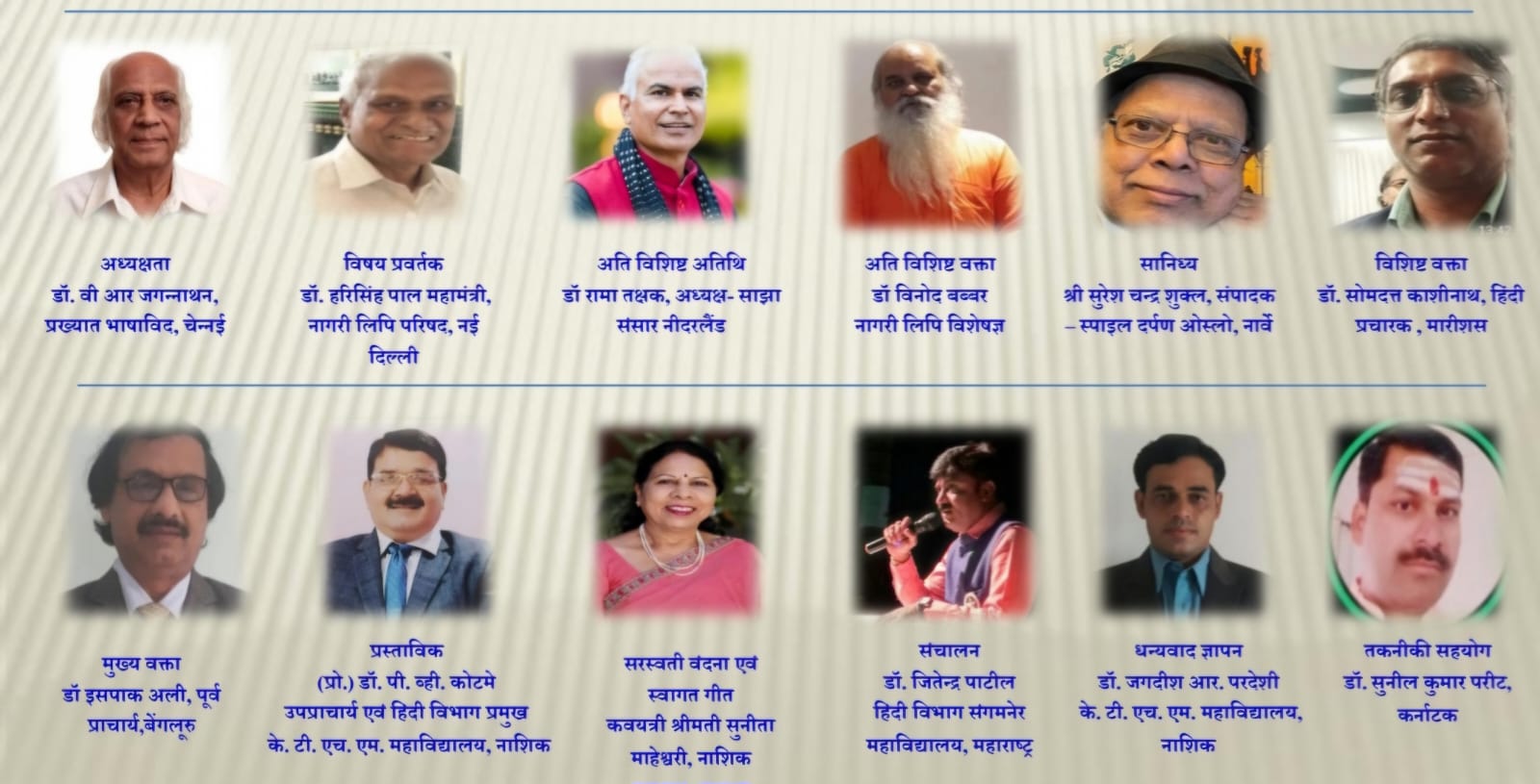ओस्लो, नार्वे के नागरी हिंदी सेवी श्री सुरेश चन्द्र शुक्ल की विशेष उपस्थिति में विशाखापत्तनम की डॉ विजया भारती जेल्दी और जैबुन्निशा, डिब्रूगढ़, असम के वरिष्ठ पत्रकार श्री ललित भूषण, मुंबई के डॉ मृगेंद्र राय,चेन्नई की डॉ के पद्मिनी, कर्नाटक के डॉ नागनाथ भेंड़े, डॉ मुजावर जैनु हामिद, चेन्नई के हिंदी विभागाध्यक्ष डॉ सी मणिकंठन, भुवनेश्वर, ओडिशा के श्री हरिराम पंसारी, भागलपुर, बिहार की डॉ पुष्पा कुमारी,, बतिया की डॉ शिप्रा मिश्रा,दिल्ली विश्वविद्यालय की प्रो शैलजा , सोनाली, डॉ रामायण पाल,छत्तीसगढ़ के रतिराम गढ़ेवाल, हरिश्चन्द्र पाल, सुबिया फैजल, डॉ अवन्तिका शर्मा, नवसारी, गुजरात की डॉ शोभना जैन, पुणे के डॉ अनिल काले,जयवीर सिंह, रोहित रत्न खैरनार सोनभद्र के डॉ ओमप्रकाश त्रिपाठी, चित्रकूट के डॉ रजनीश कुमार पाल, बिजनौर की डॉ रीना प्रताप सिंह, जौनपुर के वरिष्ठ पत्रकार डॉ ब्रजेश कुमार यदुवंशी, नाशिक की डॉ पूर्णिमा झेंडे, स्वाति पाल,जुअली कुलकर्णी, सविता मुढे,बी एच गाढीलोहार, अनीता कोष्टी, वैशाली डामले, कल्पना शैजवाल, डॉ संतोष पगार, जसप्रीत कौर,प्रो दीपमाला, हरदीप कौर, डॉ प्रकाश चिक्रूदकर सहित 100 से अधिक नागरी प्रेमियों की उपस्थिति उल्लेखनीय रही। महाविद्यालय के हिंदी प्राध्यापक डॉ जगदीश परदेशी ने धन्यवाद ज्ञापित किया।